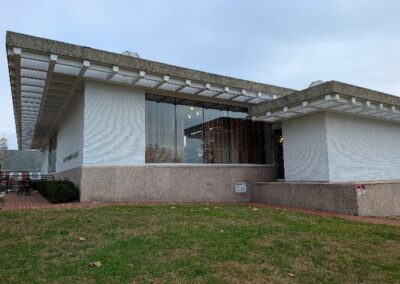 Built between 1951 and 1961, Temple Beth Israel is a well-preserved example of a Modern Movement religious building, with Modernist features including gabled roof with exposed rafters, mixture of stone and wood exterior treatments, and the glass walls on north and south sides of upper floor. The synagogue also received grant funding from PCT and The 1772 Foundation for replacement of structural beams and windows.
