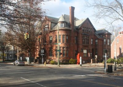 The gems of the campus are three 19th century houses: a grand c.1829 Greek Revival, home to Elizabeth Hart Jarvis (wife of gun maker, Samuel Colt); the c.1852 Oriental Revival designed by Henry Austin for Portland brownstone quarry owner Erastus Brainerd Jr.; and the 1884 Queen Anne, home of nationally recognized amateur ornithologist John H. Sage. Vacant since 2008, Preservation CT supported local preservationists and the town through a 2011 grant that underwrote the Marlborough Street National Register Historic District nomination, and a 2014 Vibrant Communities Initiative grant for a study to guide redevelopment.